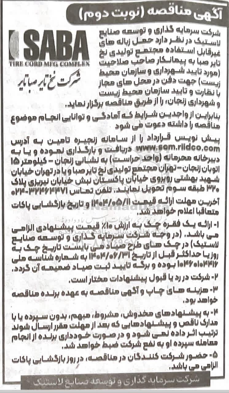 شرکت سرمایه گذاری و توسعه صنایع لاستیک در نظر دارد حمل زباله های غیر قابل استفاده مجتمع تولیدی نخ تایر صبا به پیمانکار صاحب صلاحیت مورد تایید شهرداری و سازمان محیط زیست جهت دفن در محل های مجاز با نظارت و تایید سازمان محیط زیست و شهرداری زنجان را از طریق مناقصه برگزار نماید. بنابراین از واجدین شرایط که آمادگی و توانایی انجام موضوع مناقصه را داشته دعوت میشود پیش نویس قرارداد را از سامانه زنجیره تامین به آدرس www.scm.riidco.com دریافت و بارگذاری نموده و یا به دبیرخانه محرمانه واحد حراست به نشانی زنجان - کیلومتر 15 اتوبان زنجان - تهران مجتمع تولیدی نخ تایر صبا و یا در تهران خیابان شهید بهشتی روبروی خیابان پاکستان نبش خیابان نیریزی پلاک 320 طبقه سوم تحویل نمایند. تلفن تماس 32464471-024 آخرین مهلت ارائه قیمت 1404.5.11 و تاریخ بازگشایی پاکات متعاقبا اعلام خواهد شد.