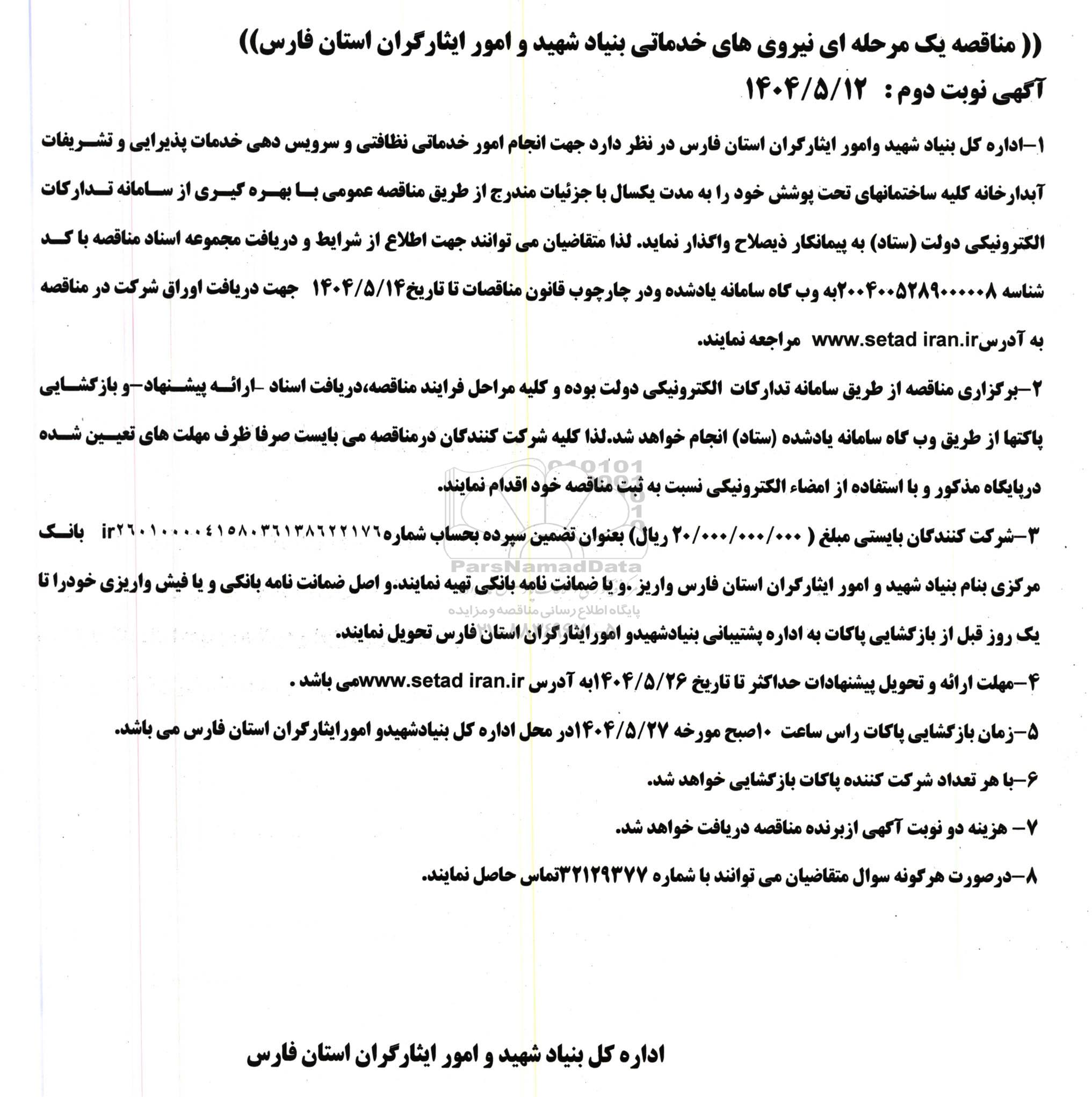 مناقصه یک مرحله ای نیروی های خدماتی بنیاد شهید و امور ایثارگران استان فارس ؟ نوبت دوم