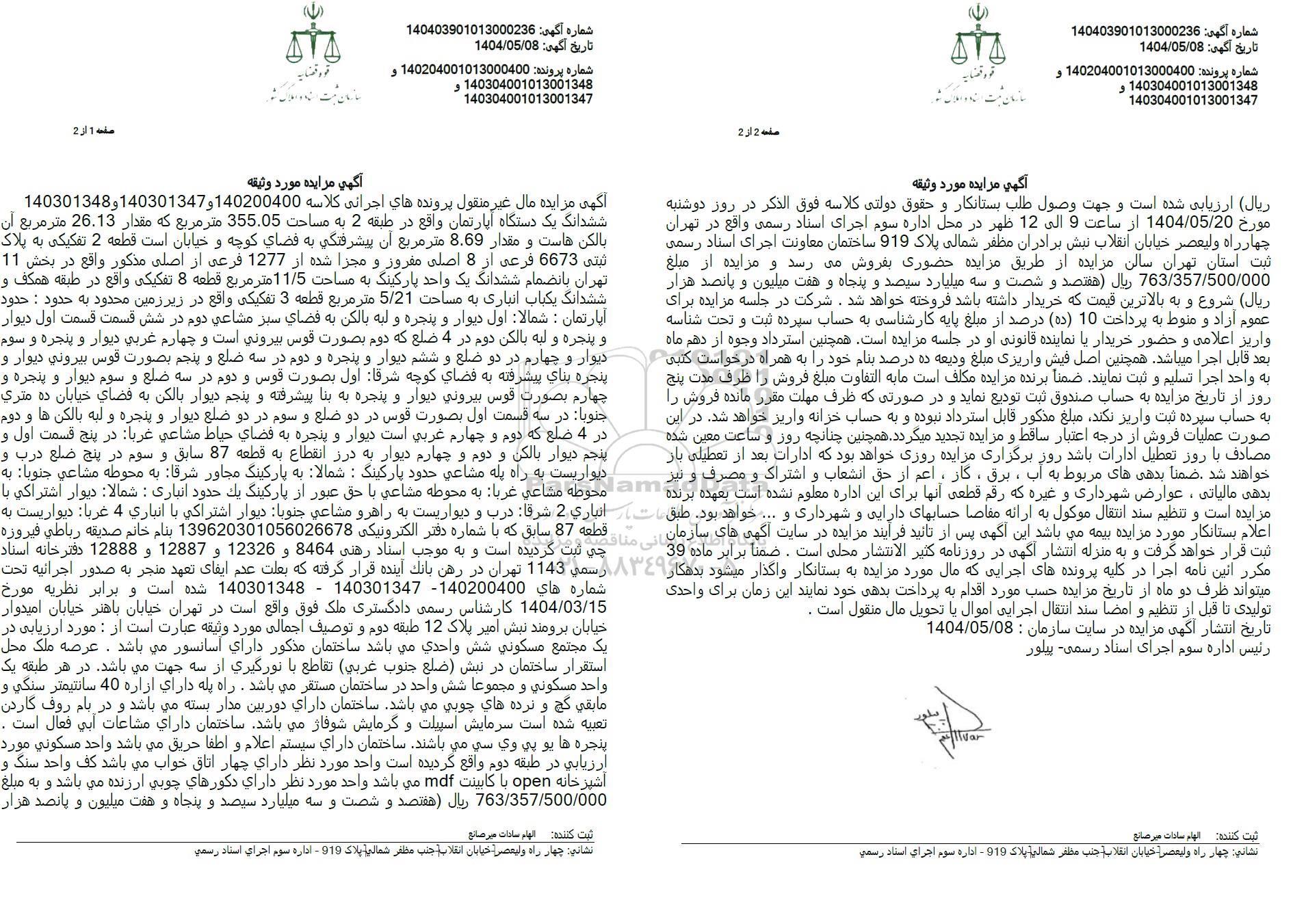 مزایده یک دستگاه آپارتمان در طبقه 2 به مساحت 355.05 مترمربع پلاک ثبتی 6673 فرعی از 8 اصلی مفروز و مجزا شده از 1277 فرعی