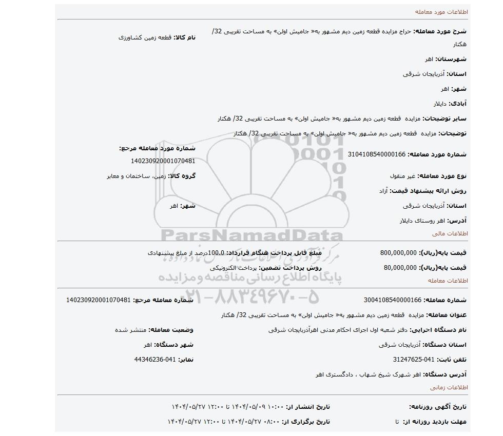 مزایده عمومی مزایده مزایده  قطعه زمین دیم مشهور به« جامیش اولن» به مساحت تقریبی 32/ هکتار برگزار میگردد. از کلیه افراد متخصص و شرکت‌های واجد شرایط دعوت به عمل می‌آید تا در این مزایده با کد خبرگزاری پارس نماد : 9348435 شرکت نمایند تاریخ شروع مزایده : 1404/05/09 مهلت شرکت در مزایده: تا پایان روز 1404/05/27 مکان برگزاری اموال واگذاری استان‌های آذربایجان شرقی و دسته‌بندی‌های مربوط به این حراجی ماشین آلات و تجهیزات کشاورزی و دام پروری, املاک و زمین میباشد.