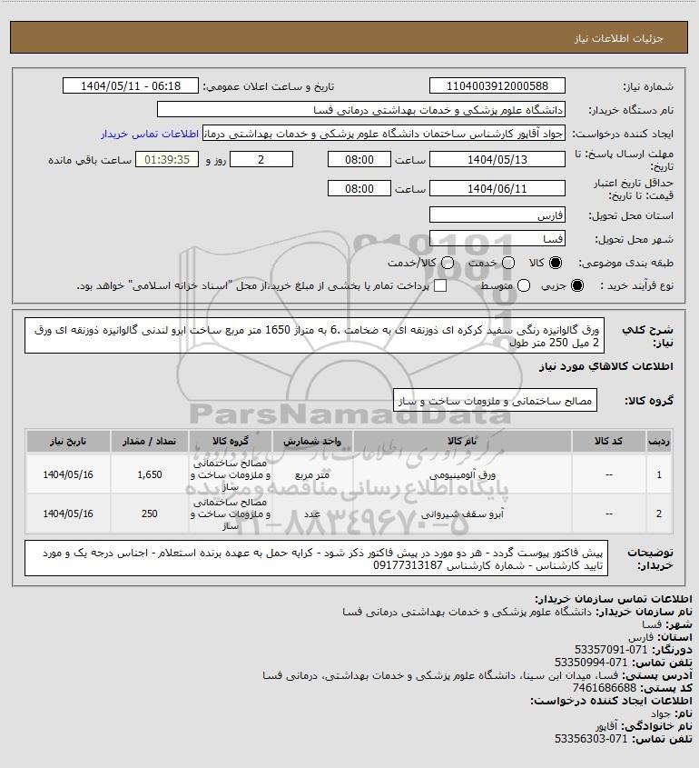 شرح کلی نیاز: ورق گالوانیزه رنگی سفید کرکره ای ذوزنقه ای به ضخامت .6 به متراژ 1650 متر مربع ساخت ابرو لندنی گالوانیزه ذوزنقه ای ورق 2 میل 250 متر طول