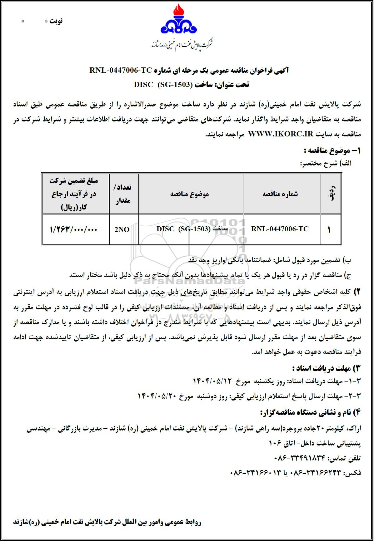 مناقصه عمومی ساخت DISC  (SG-1503), مناقصه عمومی ساخت DISC  (SG-1503)
