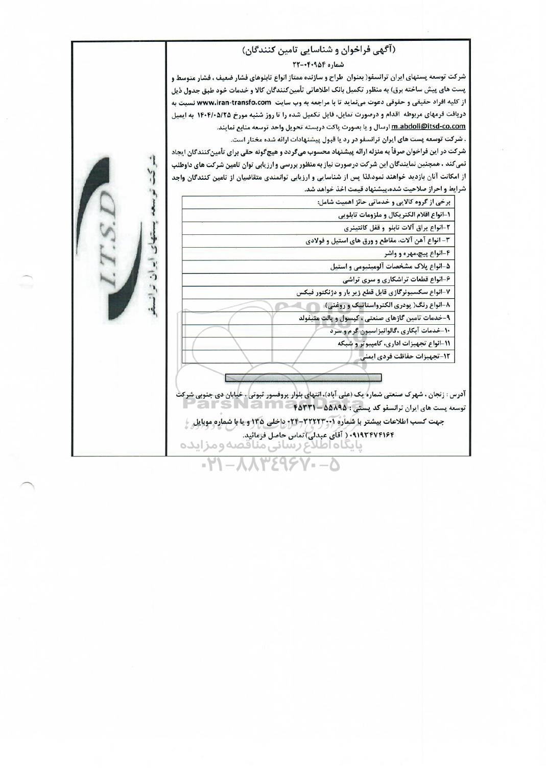 شرکت توسعه پستهای ایران ترانسفو (به عنوان طراح و سازنده ممتاز انواع تابلوهای فشار ضعیف، فشار متوسط و پست های پیش ساخته برق) به منظور تکمیل بانک اطلاعاتی تامین کنندگان کالا و خدمات خود طبق جدول ذیل از کلیه افراد حقیقی و حقوقی دعوت می نماید تا با مراجعه به وب سایت www.iran-transfo.com نسبت به دریافت فرم های مربوطه اقدام و در صورت تمایل،  فایل تکمیل شده را تا روز شنبه مورخ 1404.05.25 به ایمیل m.abdoli@itsd-co.com ارسال و یا به صورت پاکت در بسته تحویل واحد توسعه منابع نمایند.