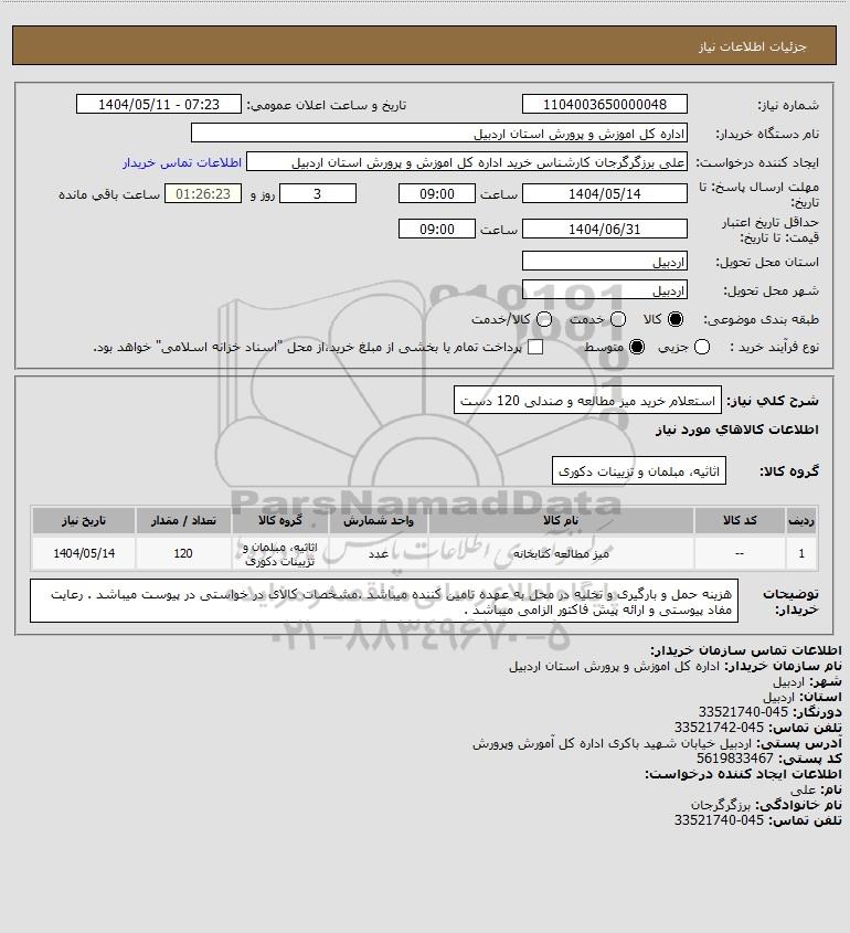 شرح کلی نیاز: استعلام خرید میز مطالعه و صندلی 120 دست