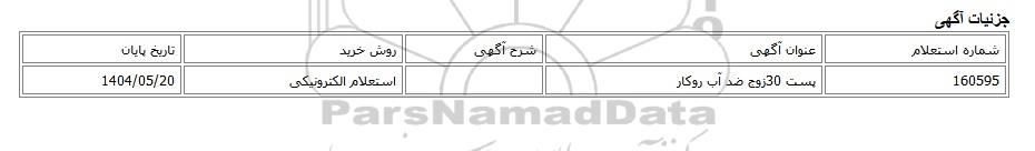 | 160595 | پست 30زوج ضد آب روکار | استعلام الکترونیکی | 1404/05/20 |