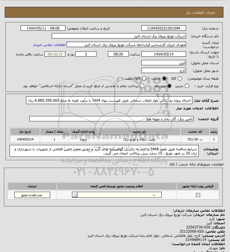 شرح کلی نیاز: اجرای پروژه روشنائی بلوار انقلاب شمالی طبق فهرست بهاء 1404 با برآورد اولیه به مبلغ 6.685.359.065 ریال
