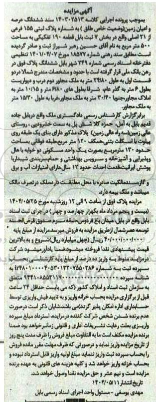 مزایده فروش ششدانگ عرصه و اعیان زمین (وضعیت خاص طلق) به شماره پلاک ثبتی 155 فرعی از 21 اصلی