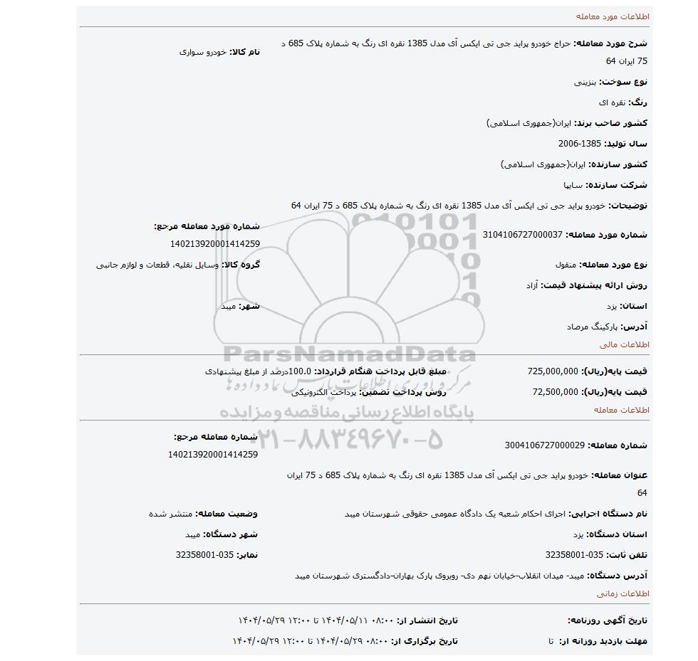 | عنوان معامله: خودرو پراید جی تی ایکس آی مدل 1385 نقره ای رنگ به شماره پلاک 685 د 75 ایران 64 | ||