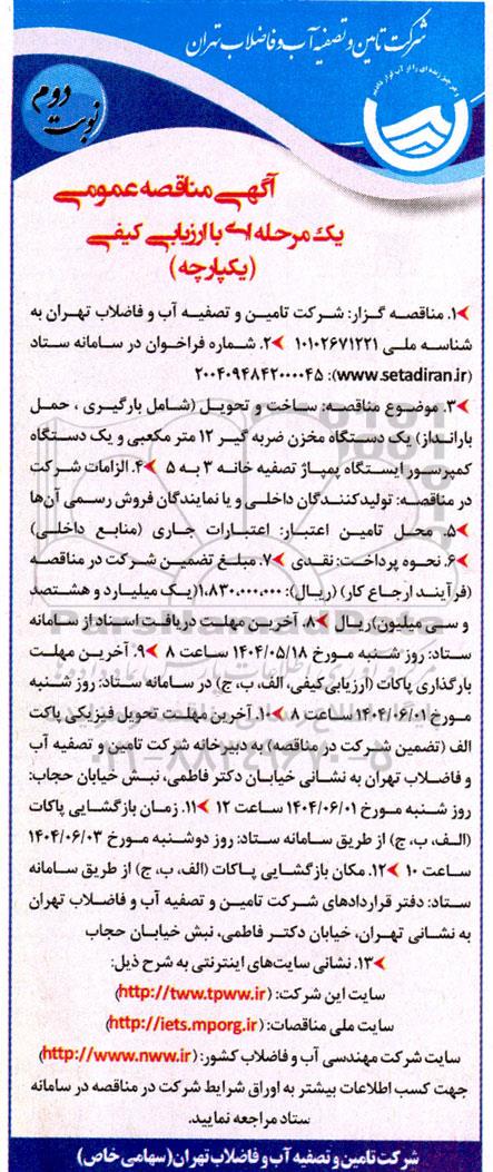 3-موضوع مناقصه: ساخت و تحویل (شامل بارگیری، حمل بارانداز) یک دستگاه مخزن ضربه گیر 12 متر مکعبی و یک دستگاه کمپرسور ایستگاه پمپاژ تصفیه خانه 3 به 5 4- الزامات شرکت در مناقصه: تولید کنندگان داخلی و یا نمایندگان فروش رسمی آنها 5-محل تامین اعتبار: اعتبارات جاری منابع داخلی 6- نحوه پرداخت نقدی 7 - مبلغ تضمین شرکت در مناقصه فرآیند ارجاع کار (ریال): 1.830.000.000 (یک میلیارد و هشتصد و سی میلیون ریال) 8- آخرین مهلت دریافت اسناد از سامانه ستاد روز شنبه مورخ 1404.05.15 ساعت8 9- آخرین مهلت بارگذاری پاکات ارزیابی کیفی، (ارزیابی فنی الف، ب، ج) در سامانه ستاد: روز شنبه مورخ 1404.06.01 ساعت 8 10- آخرین مهلت تحویل فیزیکی پاکت الف تضمین شرکت در مناقصه به دبیر خانه شرکت تامین و تصفیه آب و فاضلاب تهران به نشانی خیابان دکتر فاطمی نبش خیابان حجاب روز شنبه مورخ 1404.06.01 ساعت 12 11- زمان بازگشایی پاکات (الف، ب و ج) از طریق سامانه ستاد روز دوشنبه مورخ 1404.06.03 ساعت 10 12- مکان بازگشایی پاکات (الف، ب، ج) از طریق سامانه ستاد: دفتر قراردادهای شرکت تامین و تصفیه آب و فاضلاب تهران به نشانی تهران خیابان دکتر فاطمی نبش خیابان حجاب
