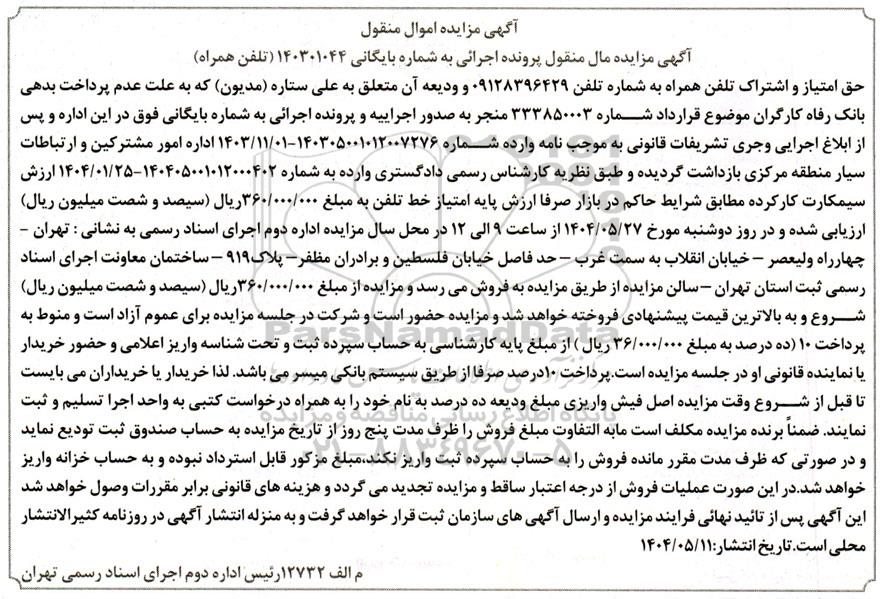 تاریخ مزایده روز دوشنبه مورخ 1404.05.27 از ساعت 9 الی 12 در محل سالن مزایده اداره دوم اجرای اسناد رسمی به نشانی تهران - چهارراه ولیعصر - خیابان انقلاب به سمت غرب - حدفاصل خیابان فلسطین و برادران مظفر - پلاک 919