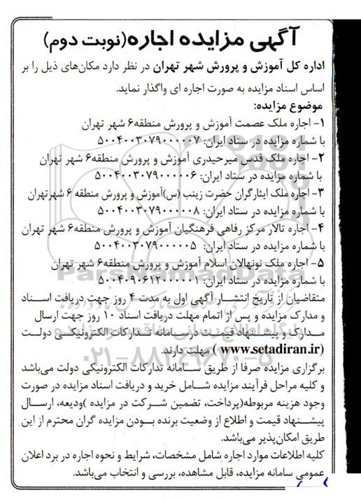 5- اجاره ملک نونهالان اسلام آموزش و پرورش منطقه 6 شهر تهران - با شماره مزایده در ستاد ایران 5004090612000001