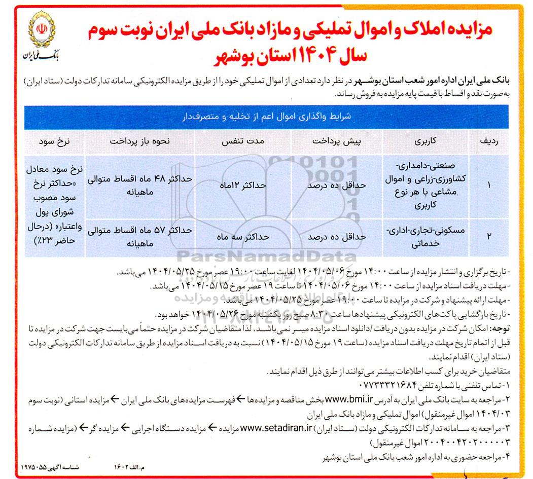 مزایده املاک و اموال تملیکی و مازاد بانک ملی ایران نوبت سوم سال 1404 استان بوشهر -
