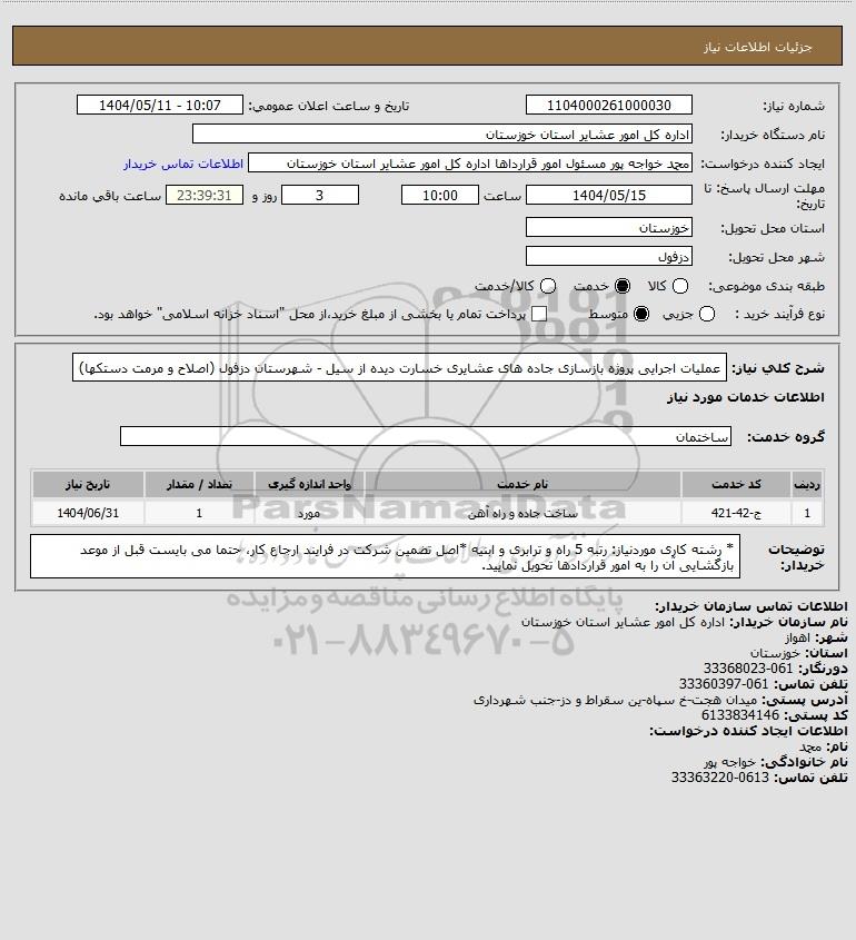 شرح کلی نیاز: عملیات اجرایی پروژه بازسازی جاده های عشایری خسارت دیده از سیل - شهرستان دزفول (اصلاح و مرمت دستکها)