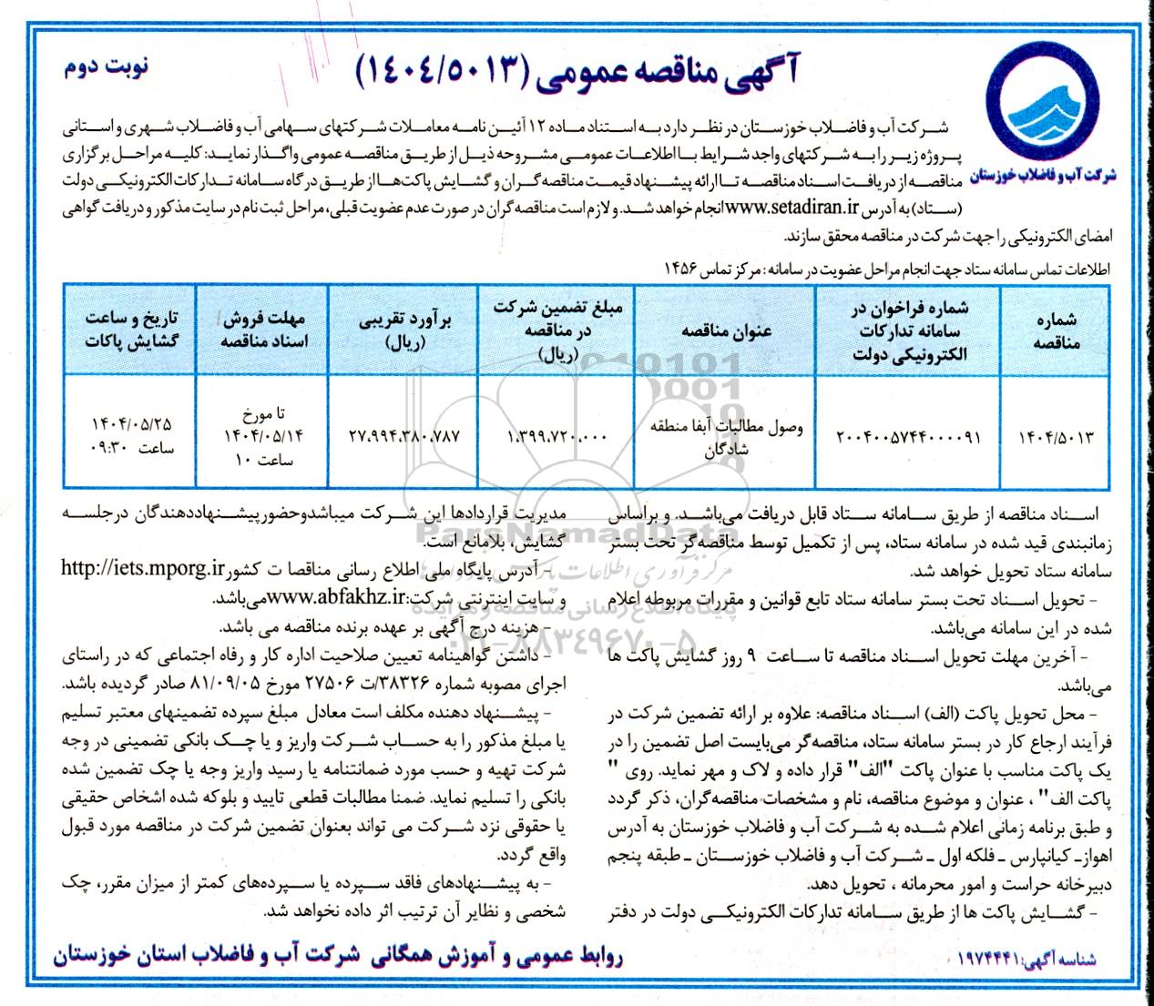 عنوان مناقصه: وصول مطالبات آبفا منطقه شادگان
