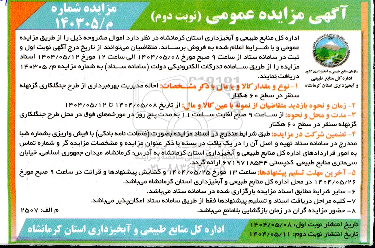 اداره کل منابع طبیعی و آبخیزداری استان کرمانشاه در نظر دارد اموال مشروحه ذیل را از طریق مزایده عمومی و با شرایط اعلام شده به فروش برساند. متقاضیان میتوانند از تاریخ درج آگهی نوبت اول و ثبت در سامانه ستاد از ساعت 9 صبح مورخ 1404.05.08 الى ساعت 12 مورخ 1404.05.12 اسناد مزایده را از طریق سامانه تدارکات الکترونیکی دولت سامانه ستاد به شماره مزایده م / 140305 دریافت نمایند.