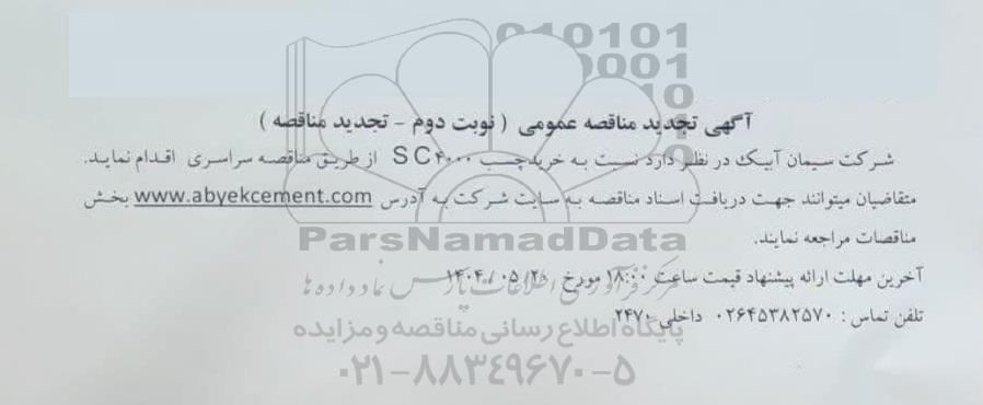 شرکت سیمان آبیک در نظر دارد نسبت به خرید چسب SC4000 از طریق مناقصه سراسری اقدام نماید.
