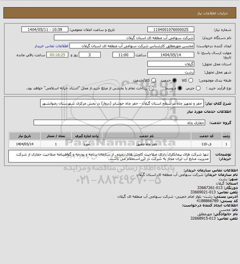 شرح کلی نیاز: حفر و تجهیز چاه در سطح استان گیلان - حفر چاه خوشابر (درواز) در بخش مرکزی شهرستان رضوانشهر