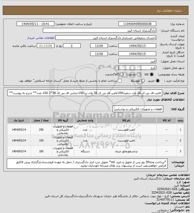 شرح کلی نیاز: لامپ اف پی ال 36 وات سفید250-لامپ اف پی ال 36 وات زرد150-ترانس اف پی ال 36*2 100 عدد** شرح به پیوست**