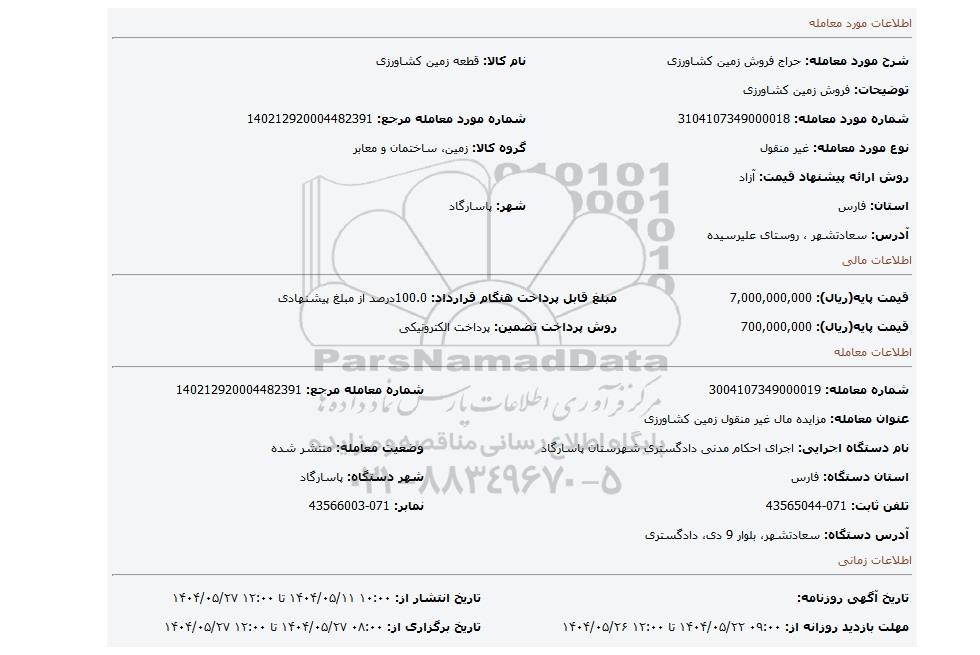 نام دستگاه اجرایی: اجرای احکام مدنی دادگستری شهرستان پاسارگادوضعیت معامله: منتشر شده