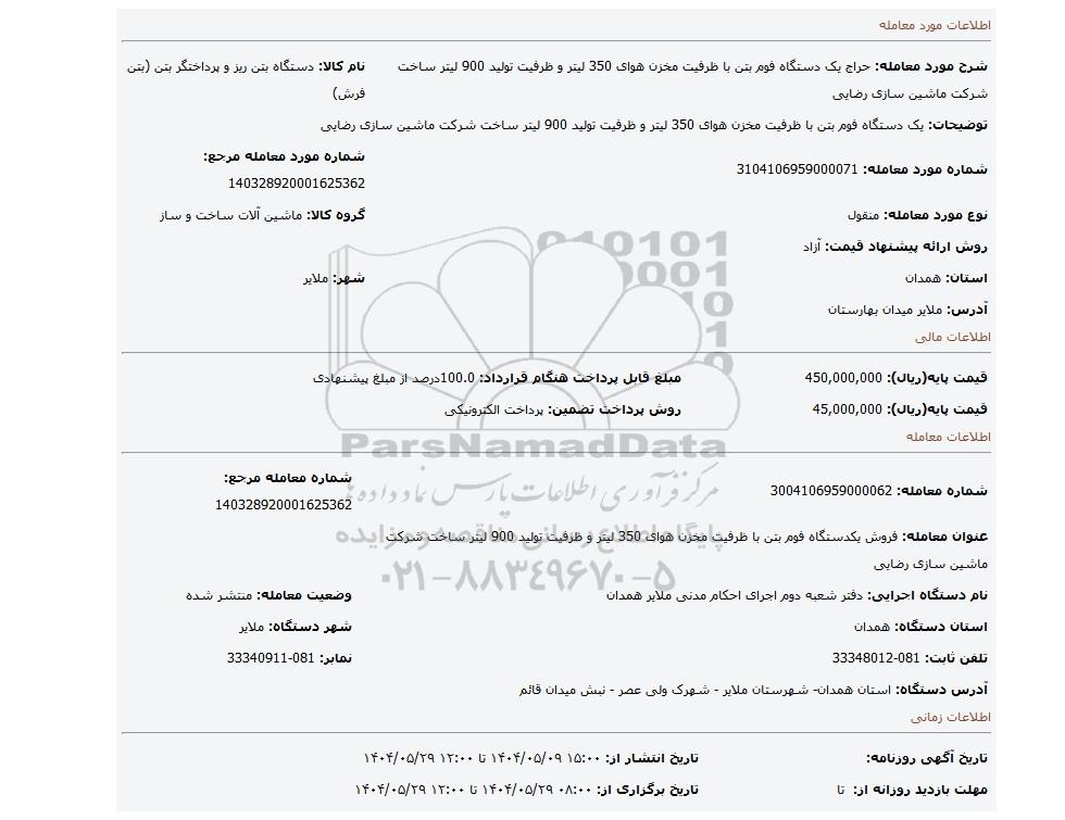 مزایده عمومی مزایده یک دستگاه فوم بتن با ظرفیت مخزن هوای 350 لیتر و ظرفیت تولید 900 لیتر ساخت شرکت ماشین سازی رضایی برگزار میگردد. از کلیه افراد متخصص و شرکتهای واجد شرایط دعوت به عمل میآید تا در این مزایده با کد خبرگزاری پارس نماد : 9351845 شرکت نمایند تاریخ شروع مزایده : 1404/05/09 مهلت شرکت در مزایده: تا پایان روز 1404/05/29 مکان برگزاری اموال واگذاری استانهای همدان و دستهبندیهای مربوط به این حراجی ماشین آلات ساختمانی میباشد.