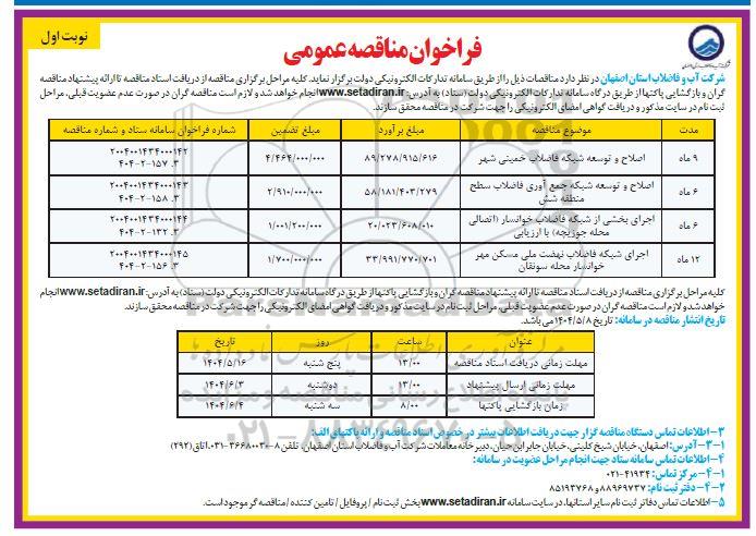 | 9 ماه | اصلاح و توسعه شبکه فاضلاب خمینی شهر | 89.278.915.616 | 4.464.000.000 | 2004001434000142 404-2-157.3 |