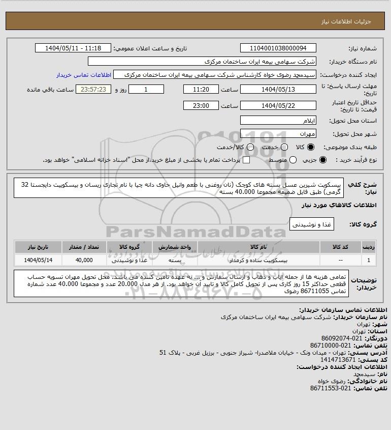 شرح کلی نیاز: بیسکویت شیرین عسل بسته های کوچک (نان روغنی با طعم وانیل حاوی دانه چیا با نام تجاری ریسان و بیسکوییت دایجستا 32 گرمی) طبق فایل ضمیمه مجموعا 40.000 بسته