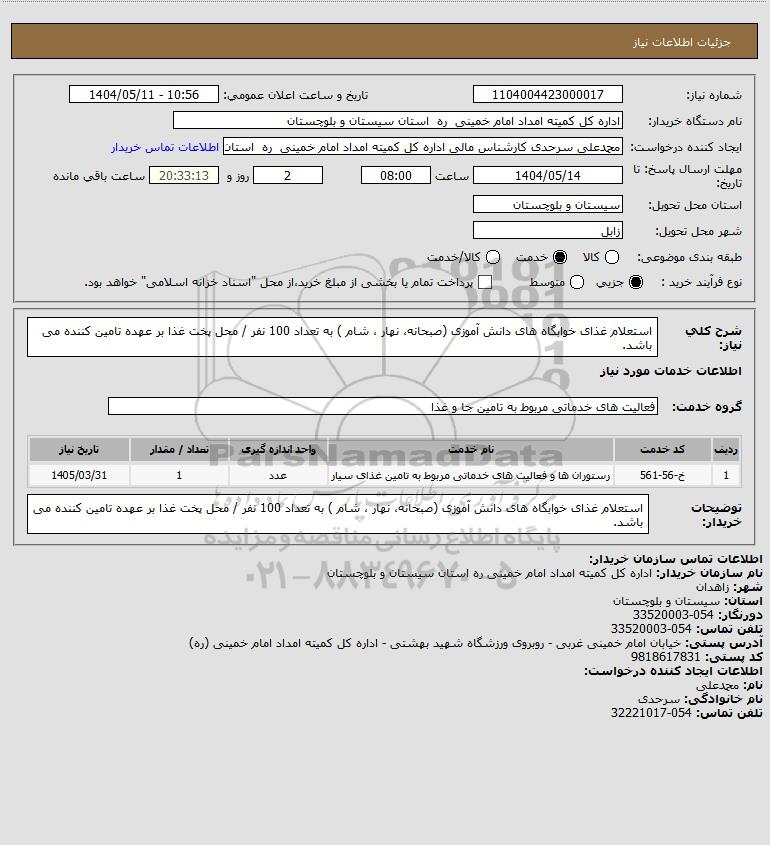 شرح کلی نیاز: استعلام غذای خوابگاه های دانش آموزی (صبحانه، نهار ، شام ) به تعداد 100 نفر / محل پخت غذا بر عهده تامین کننده می باشد.