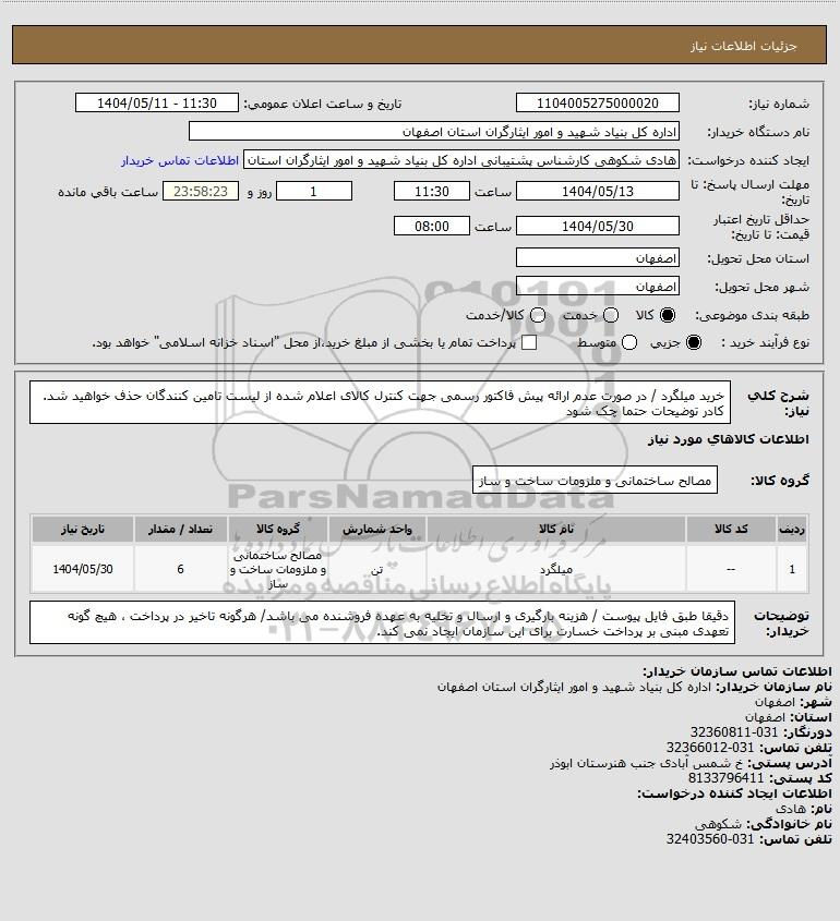| 1 | -- | میلگرد | تن | مصالح ساختمانی و ملزومات ساخت و ساز | 6 | 1404/05/30 |