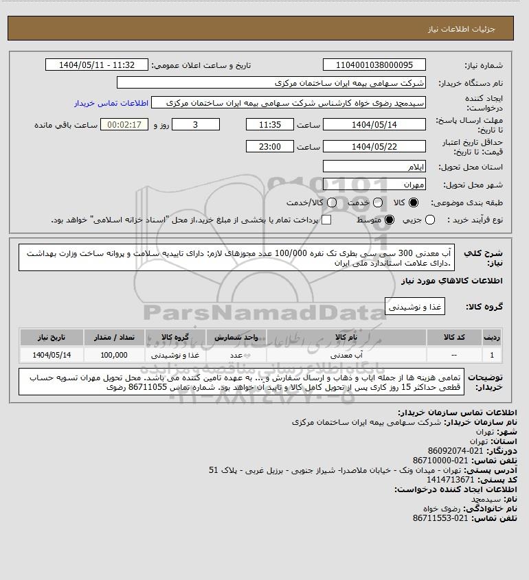 شرح کلی نیاز: آب معدنی 300 سی سی بطری تک نفره 100/000 عدد مجوزهای لازم: دارای تاییدیه سلامت و پروانه ساخت وزارت بهداشت .دارای علامت استاندارد ملی ایران