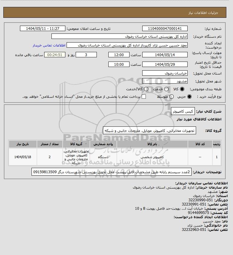 | 1 | -- | کامپیوتر شخصی | دستگاه | تجهیزات مخابراتی، کامپیوتر، موبایل، ملزومات جانبی و شبکه | 2 | 1404/05/18 |