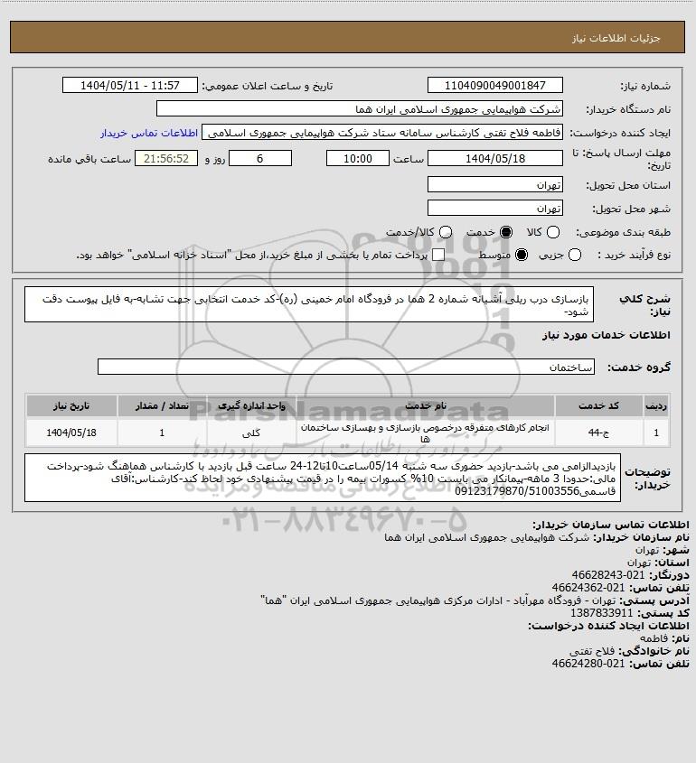 شرح کلی نیاز: بازسازی درب ریلی آشیانه شماره 2 هما در فرودگاه امام خمینی (ره)-کد خدمت انتخابی جهت تشابه-به فایل پیوست دقت شود-