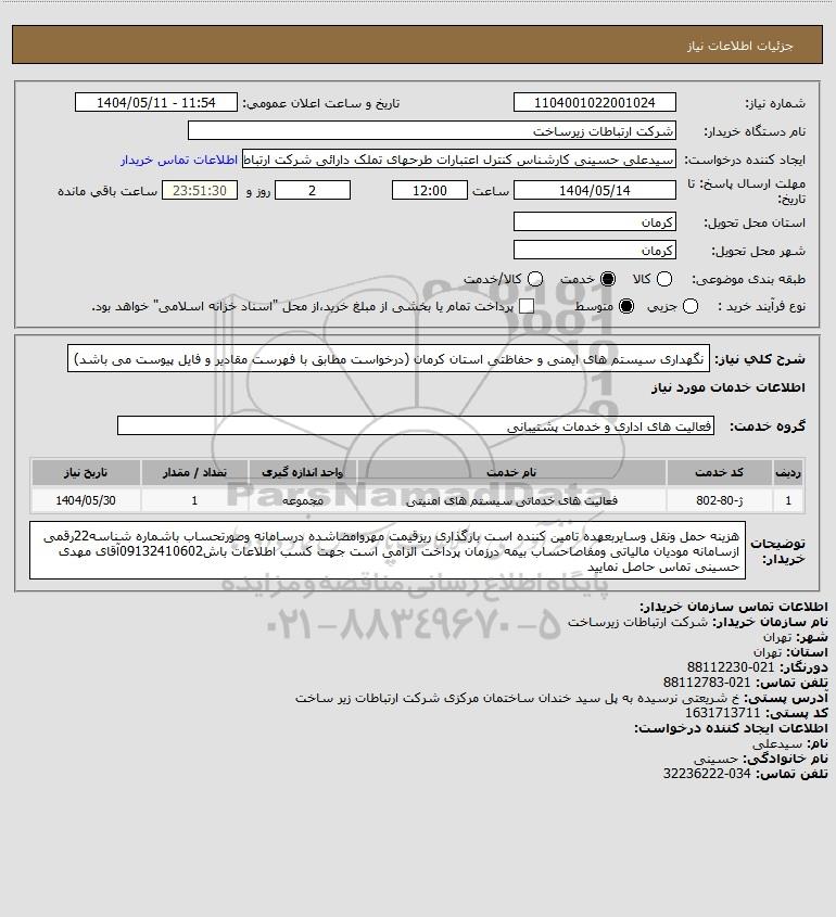 شرح کلی نیاز: نگهداری سیستم های ایمنی و حفاظتی استان کرمان (درخواست مطابق با فهرست مقادیر و فایل پیوست می باشد)