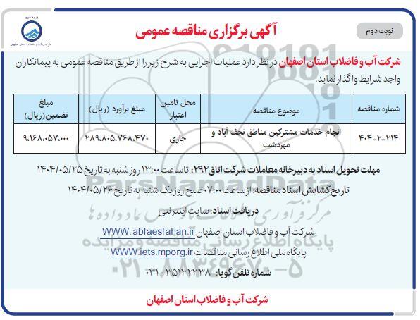 | 404-2-214 | انجام خدمات مشترکین مناطق نجف آباد و مهردشت | جاری | 289.805.768.470 | 9.168.057.000 |