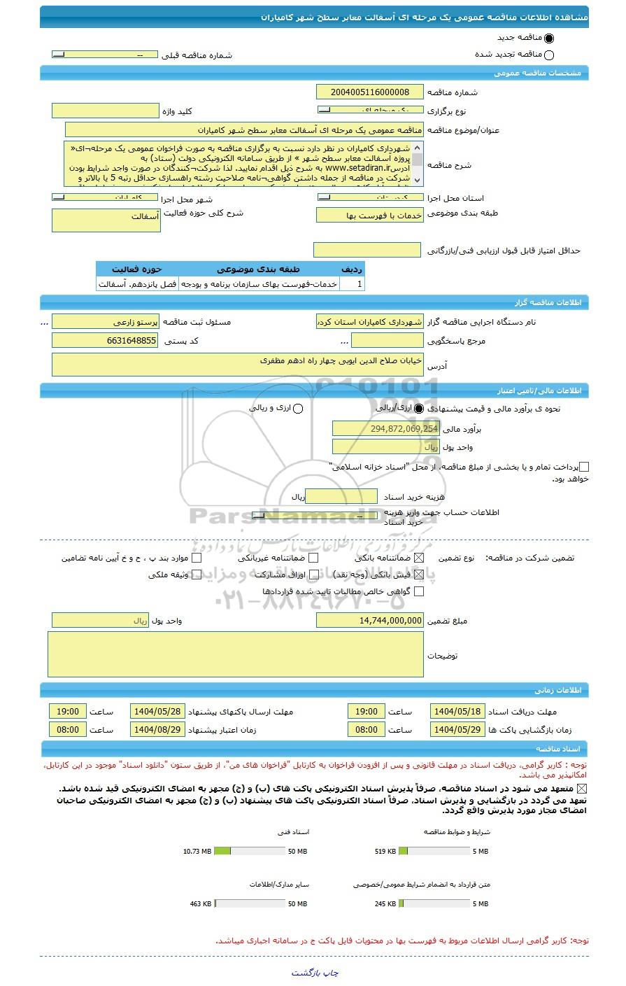 نام دستگاه اجرایی مناقصه گزارشهرداری کامیاران استان کردستانمسئول ثبت مناقصهپرستو زارعی