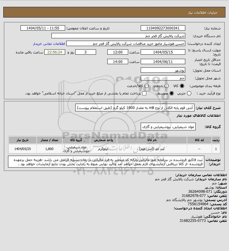 شرح کلی نیاز: آنتی فوم پایه الکلی از نوع m8 به مقدار 1800 کیلو گرم (طبق استعلام پیوست)