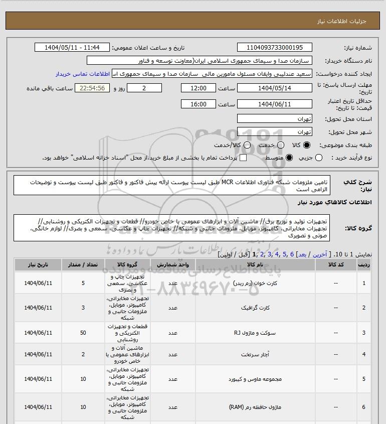 شرح کلی نیاز: تامین ملزومات شبکه فناوری اطلاعات MCR طبق لیست پیوست