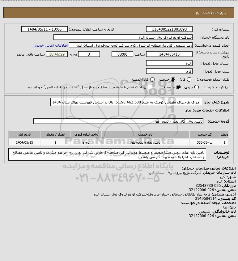 شرح کلی نیاز: اجرای طرحهای مقیاس کوچک به مبلغ 5.190.463.500 ریال بر اساس فهرست بهای سال 1404