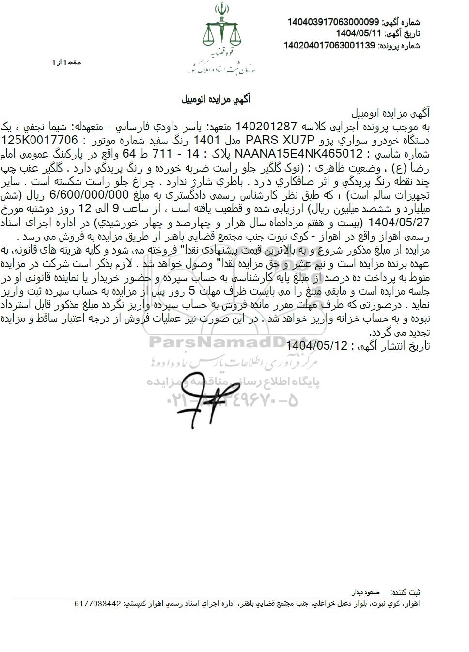 مزایده فروش یکدستگاه خودروی سوار پژو رنگ سفید