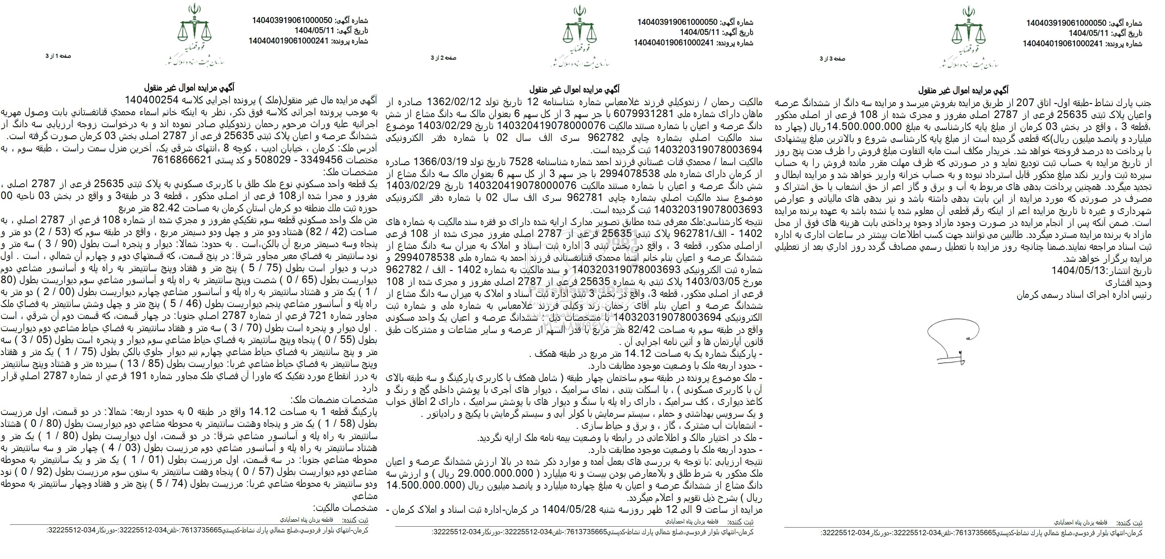 مزایده عمومی مزایده یک قطعه واحد مسکونی به پلاک ثبتی 25635 فرعی از 2787 اصلی برگزار میگردد. از کلیه افراد متخصص و شرکت‌های واجد شرایط دعوت به عمل می‌آید تا در این مزایده با کد خبرگزاری پارس نماد : 9353405 شرکت نمایند تاریخ شروع مزایده : 1404/05/11 مهلت شرکت در مزایده: تا پایان روز 1404/05/28 مکان برگزاری اموال واگذاری استان‌های کرمان و دسته‌بندی‌های مربوط به این حراجی املاک و زمین میباشد.