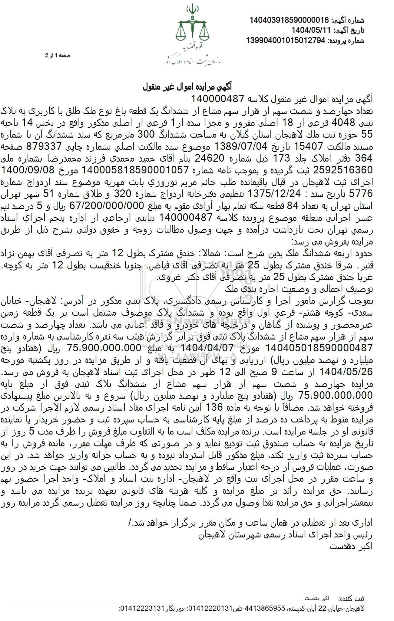 مزایده ششدانگ یک قطعه باغ با کاربری به پلاک 4048 فرعی از 18 اصلی مفروز , مزایده ششدانگ یک قطعه باغ با کاربری به پلاک 4048 فرعی از 18 اصلی مفروز