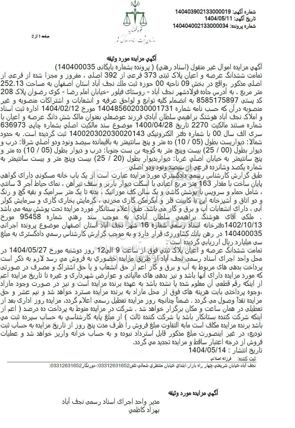 مزایده فروش ملک به مساحت 252.13 مترمربع پلاک ثبتی 373 فرعی از 392 اصلی