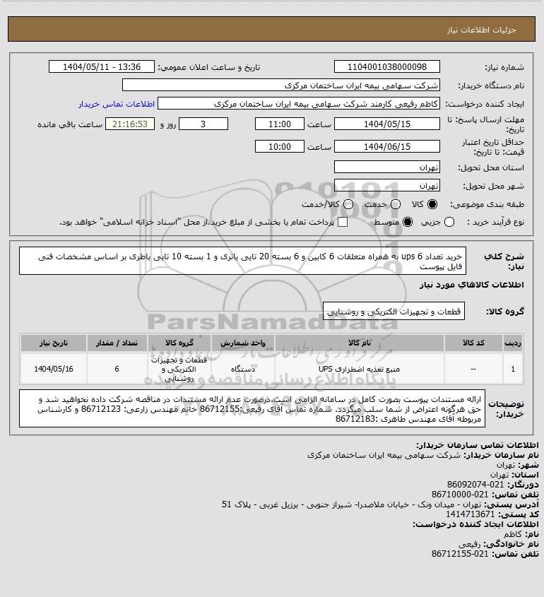 شرح کلی نیاز: خرید تعداد 6 ups به همراه متعلقات 6 کابین و 6 بسته 20 تایی باتری و 1 بسته 10 تایی باطری بر اساس مشخصات فنی فایل پیوست
