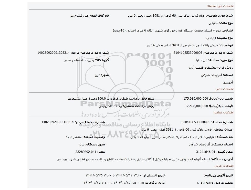 | شرح مورد معامله: حراج فروش پلاک ثبتی 66 فرعی از 3981 اصلی بخش 6 تبریز | نام کالا: قطعه زمین کشاورزی | |