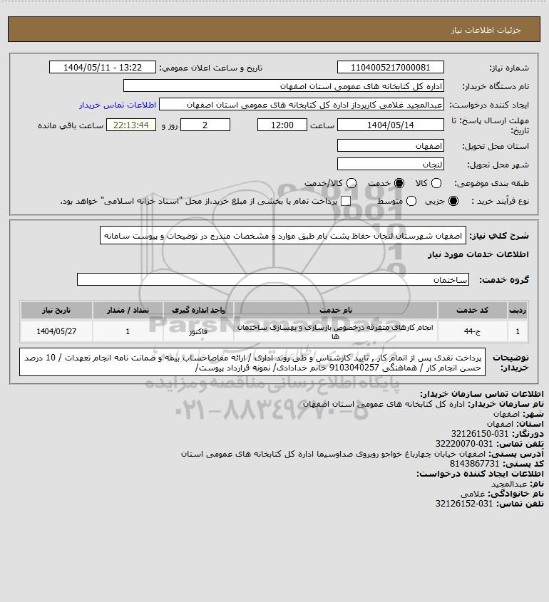 شرح کلی نیاز: اصفهان شهرستان لنجان حفاظ پشت بام طبق موارد و مشخصات مندرج در توضیحات و پیوست سامانه