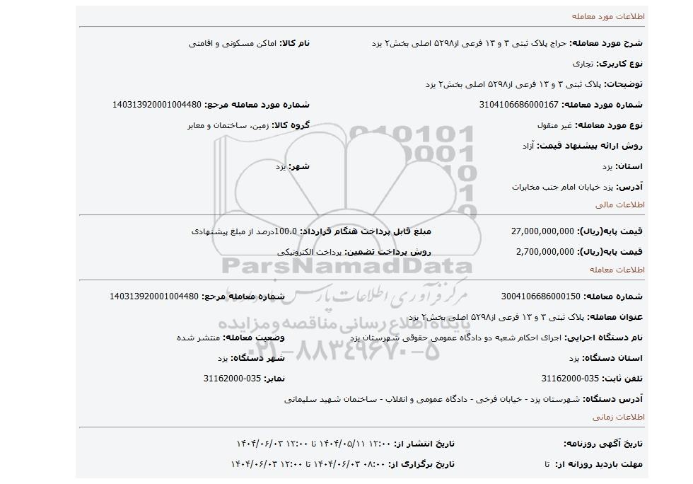 | شرح مورد معامله: حراج پلاک ثبتی ۳ و ۱۳ فرعی از۵۲۹۸ اصلی بخش۲ یزد | نام کالا: اماکن مسکونی و اقامتی | |