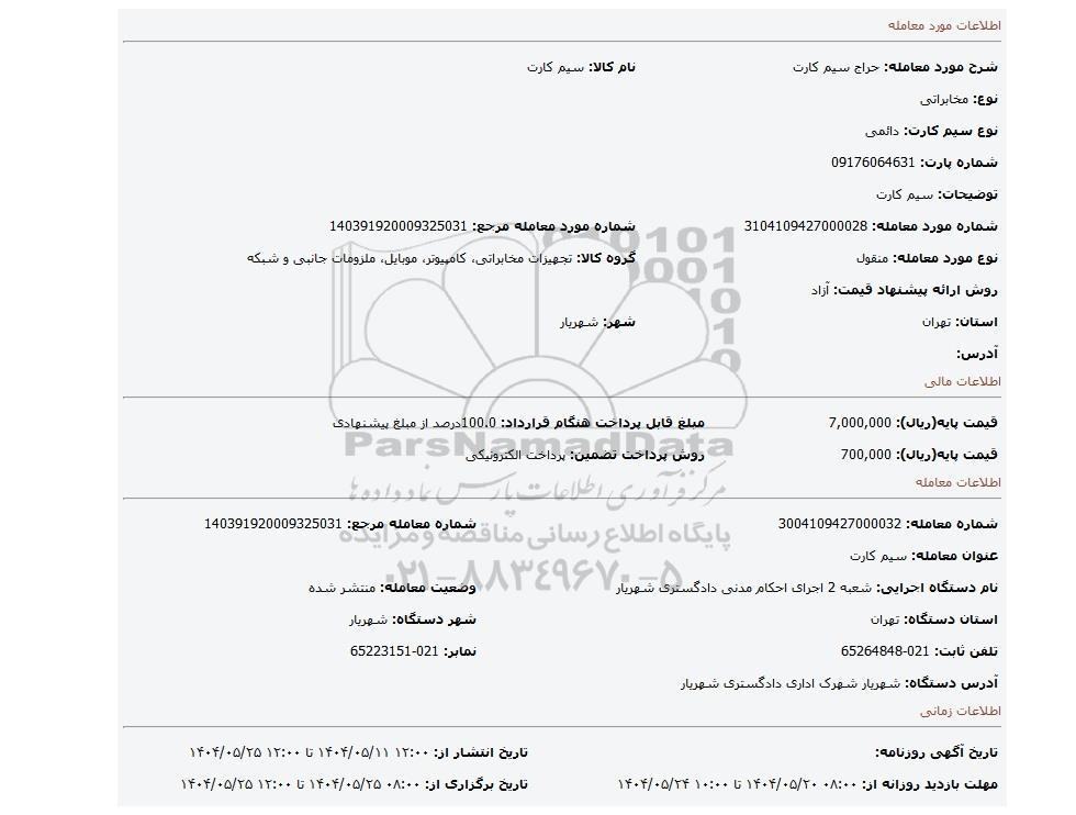| شرح مورد معامله: حراج سیم کارت | نام کالا: سیم کارت | |
