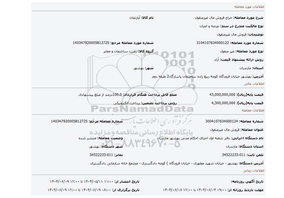 شرح مورد معامله: حراج فروش مال غیرمنقولنام کالا: آپارتمان
