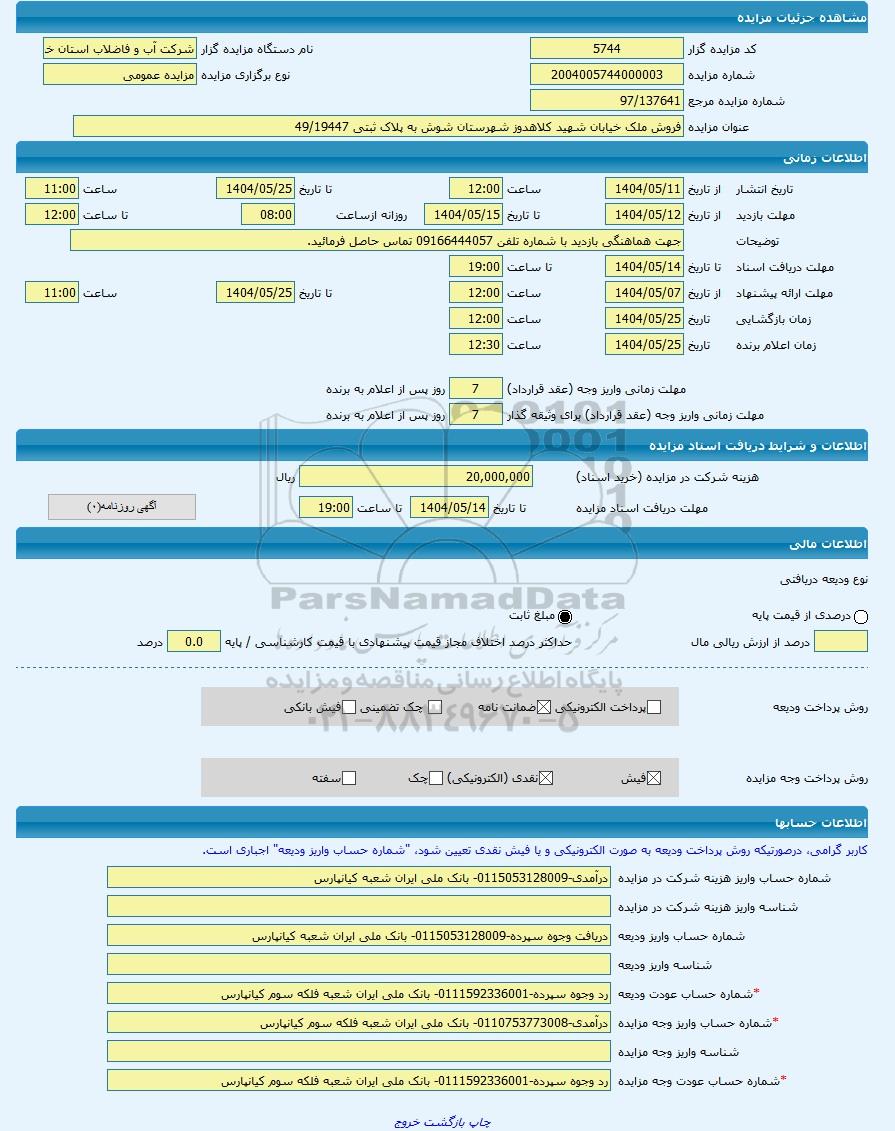 | شماره مال | 2104005744000003 | نوع برگزاری مزایده | مزایده عمومی | |