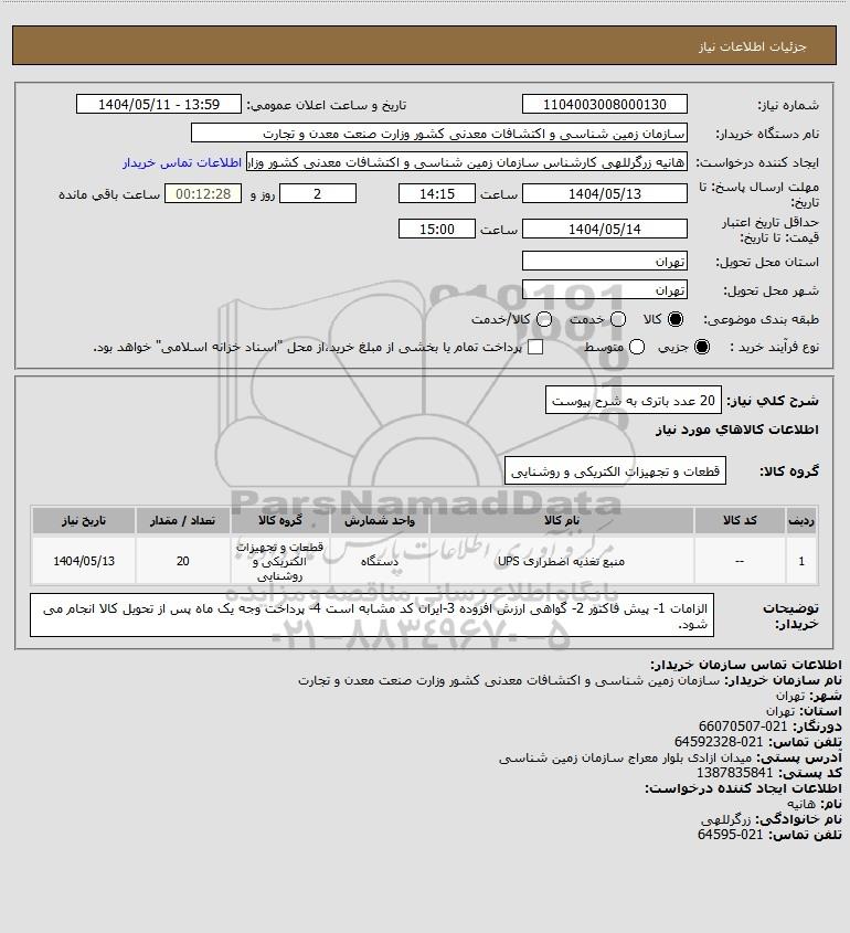 شرح کلی نیاز: 20 عدد باتری به شرح پیوست
