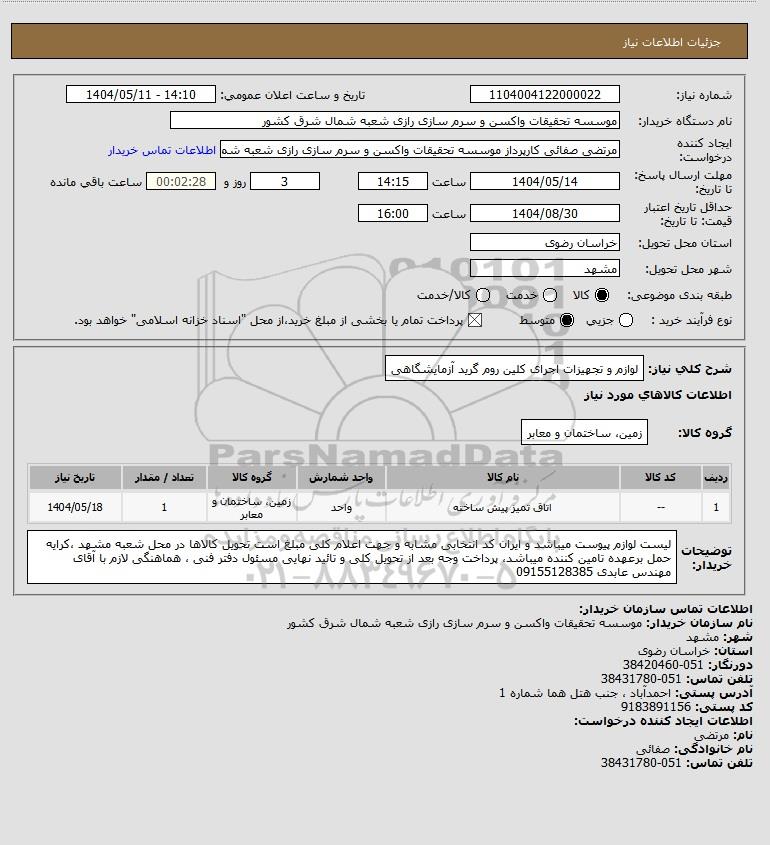 شرح کلی نیاز: لوازم و تجهیزات اجرای کلین روم گرید آزمایشگاهی